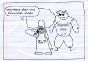 {Cut to Peacey P, wearing a jersey labeled "☮y P" ("[Peace symbol]y P"), standing with Olympic Man (with a blurred jersey)}