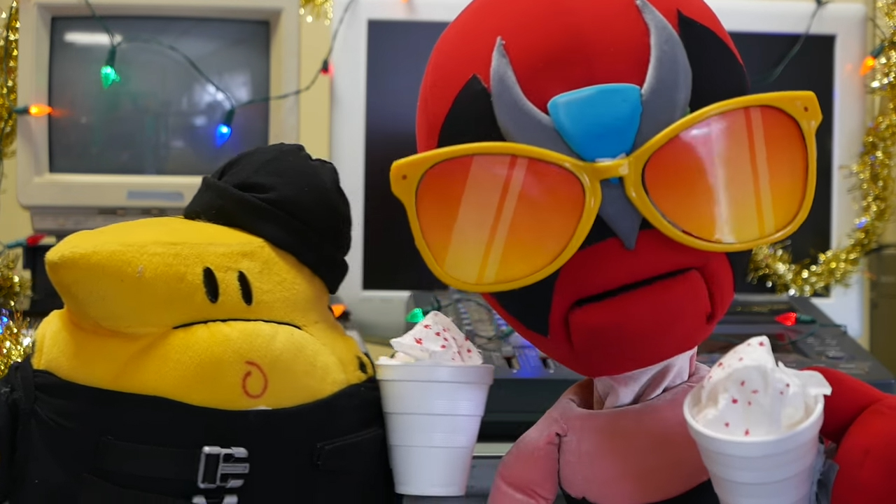 Puppet The Cheat and Puppet Strong Bad drinking Santaman's Chimneys (from Dangeresque Puppet Squad: The Hot Jones Hijack)