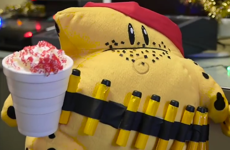 Puppet Fightgar holding a Santaman's Chimney at the Cheat Commandos Headquarters Playset (from Dangeresque Puppet Squad: The Hot Jones Hijack)