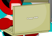 Clicking on the Lappy's screen simulates the effect seen on laptop LCDs: applied force moves the liquid inside (a Liquid Crystal Display), causing a "wave" of distorted colors. Whenever the Lappy 486 is seen in a new email or toon, when you click on the screen to get the effect that is similar on most LCD flat panel monitors. The circle you get matches the color of what is in the reflection (i.e. Red for Strong Bad's head, green for Strong Bad's eyes, etc.), but after a few days or so, the circle is always white. This is also Strong Bad's first computer without contrast buttons besides the Polish Block.