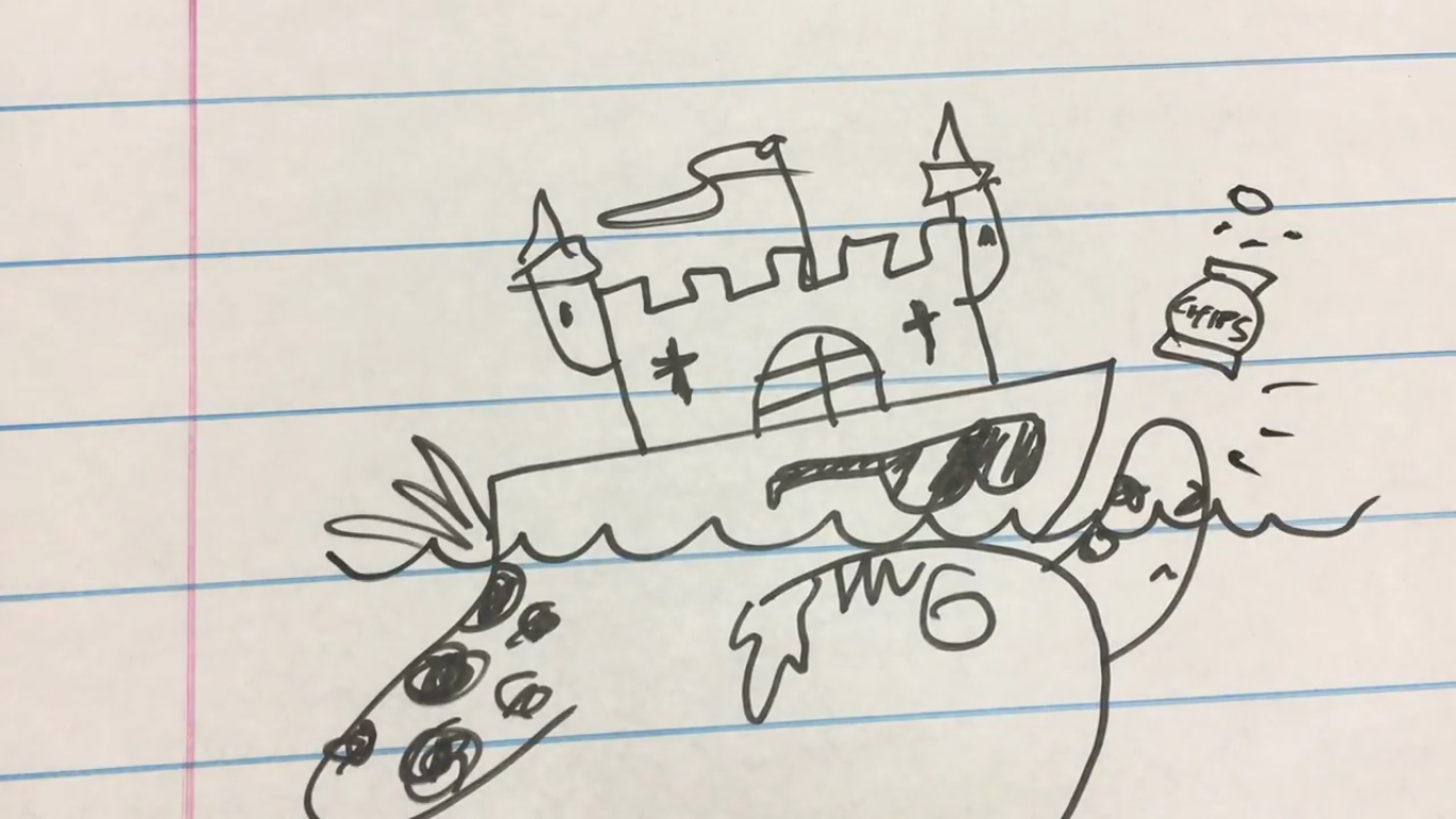 Strong Bad's Skills of an Artist drawing of a really cool boat with a castle for a pilot house—which turns out to be a chip-seeking Cheatviathan in disguise (from Really Cool Boat)