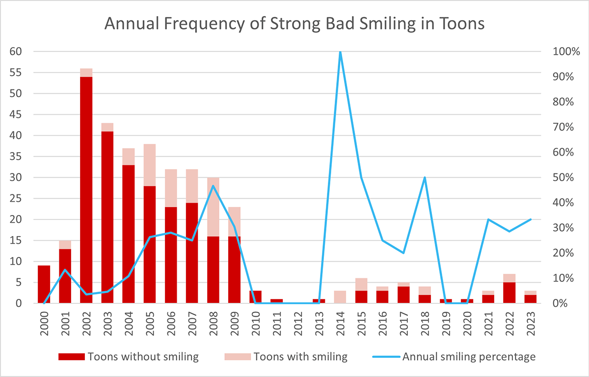 Annual frequency of Strong Bad Smiling in toons from 2000 through 2009. Stacked bars indicate number of annual toon appearances, with red portions denoting toons without smiling and pink indicating toons where he smiled. The blue line indicates the overall percentage of toons that year in which a smile appeared.